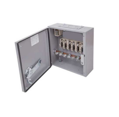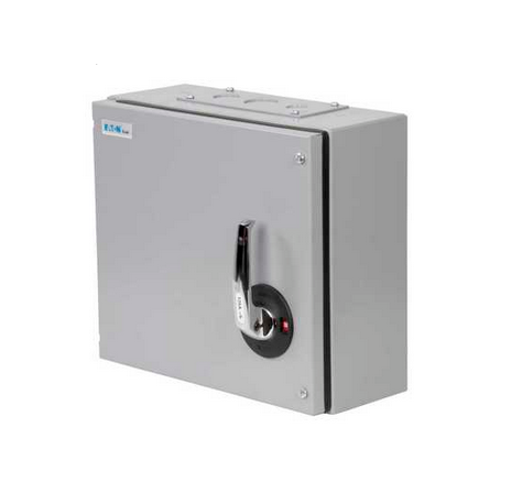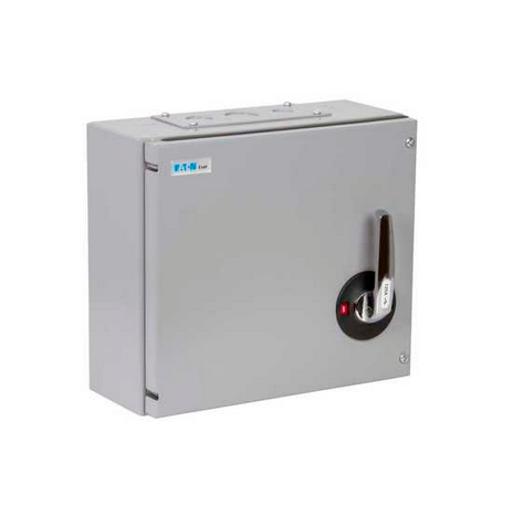 The Eaton MEM 100AXTN2 Three Phase TPN 100A 415V Switch Disconnector with surface-mounting enclosure fabricated from rust-protected sheet steel with a light grey paint finish.