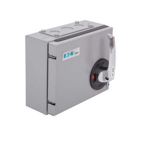The Eaton MEM 15AXTN2 Three Phase TPN 20A 415V Switch Disconnector with surface-mounting enclosure fabricated from rust-protected sheet steel with a light grey paint finish.
